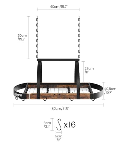 CHOEZON 31.7-Inch Hanging Pot Rack, Space-Saving Pot Hanger for Kitchen, Ceiling Pan Hanging Rack with 16 Detachable S Hooks, Sturdy Metal Frame, Industrial Style, Rustic Brown and Black TPR09BF