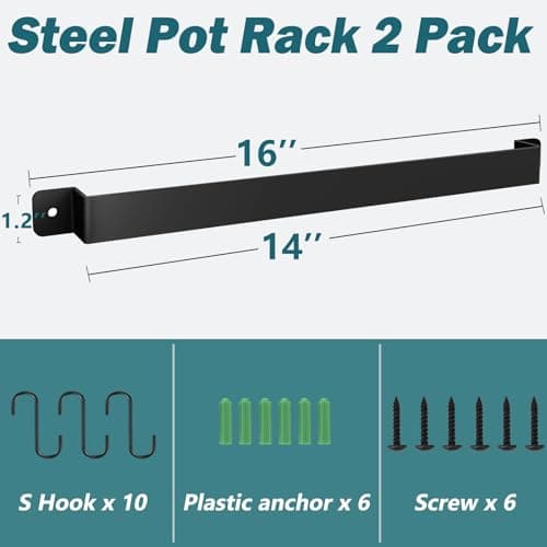 Black Hanging Pot and Pan Rack Organizer Space-Saving Ceiling Mount Cookware Storage Rack 2 Heavy Duty Swag Hangers and 15 S-Hooks; Bonus - 2 Heat Resistant Oven Mitts.Colgador Para ollas Y Sartenes.