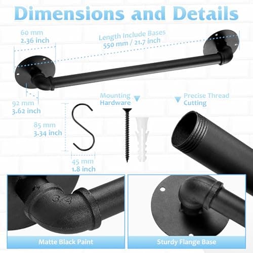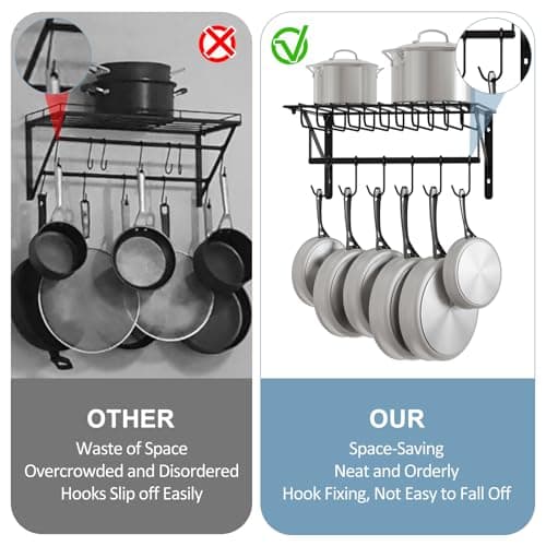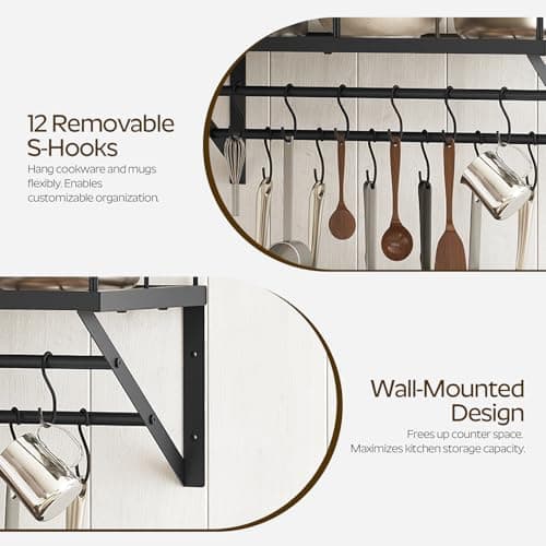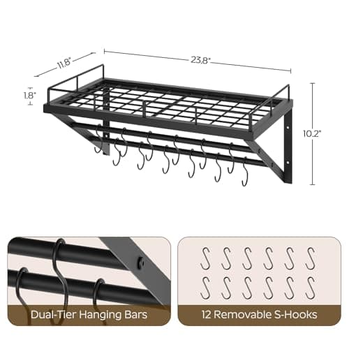 OROPY 23 Inch Wall Mounted Pot Rack Storage Shelf with 2 Tier Hanging Rails 12 S Hooks included, Ideal for Pans, Utensils, Cookware, Plant Black