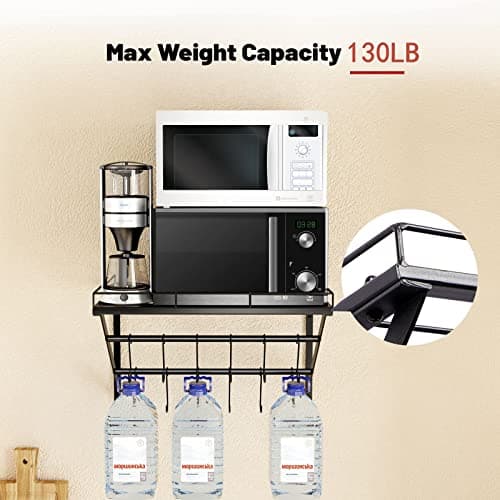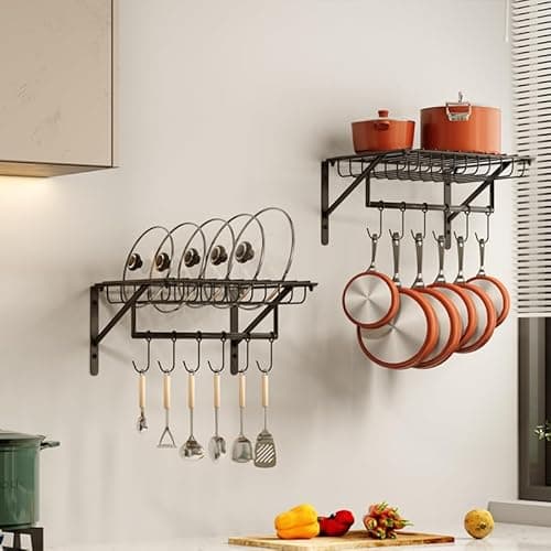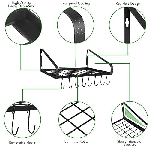 Felibeaco Hanging Pots & Pans Rack,Wall Mounted Pots Pans Organizer Holder Rack with 8 Hooks, Kitchen Wall Storage Organizer Hanger Shelves for Pans Set, Utensils, Cookware, Books, Household,Black