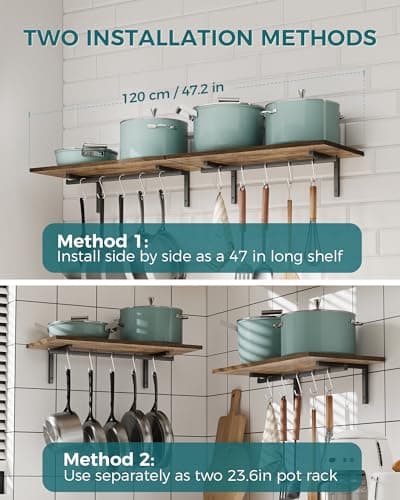 OROPY 2 Pack Wooden 23.6'' Pot Pan Hanging Rack Wall Mounted with 10 S Hooks, Set of 2 Large Pot Wall Holder Kitchen Shelves for Utensils, Cookware