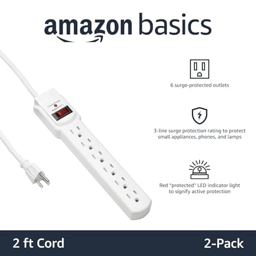 Amazon Basics Surge Protector Power Strip, 6-Outlet with 200J Protection, Circuit Breaker, LED Indicator, On/Off Switch, Wall-Mounting, 2ft Extension Cord, White, 2-Pack