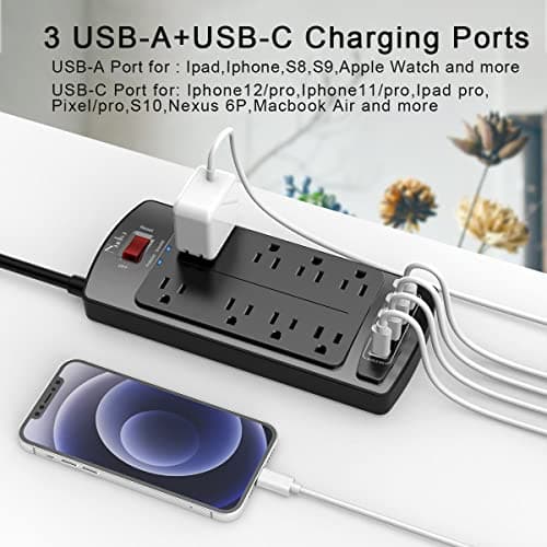 Surge Protector Power Strip - 6 Ft Flat Plug Extension Cord with 8 Widely Outlets and 4 USB Ports(1 USB C), 3 Side Outlet Extender for Home Office, White, ETL Listed