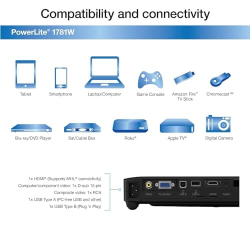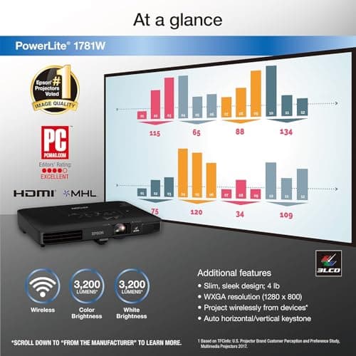 Epson PowerLite 1781W WXGA 3200 Lumens Equal Color and White brightness, Wireless 3LCD Portable Projector - Black
