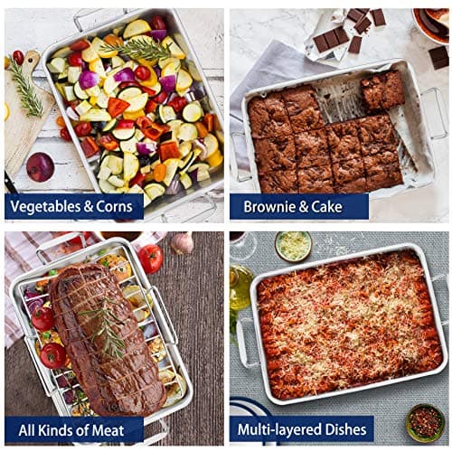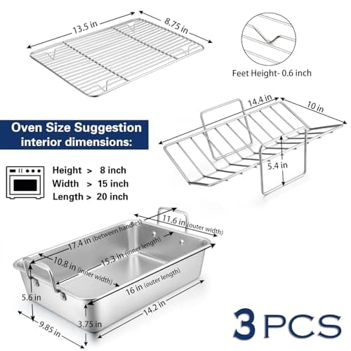 P&P CHEF 16" Roaster Roasting Pan with Baking Rack and V-shaped Rack, Stainless Steel Rectangular Lasagna Pan with Handles for Turkey Chicken, Healthy & Dishwasher Safe, 3 Pieces, Silver
