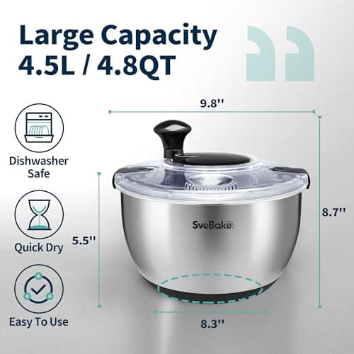SveBake 5.3Qt Stainless Steel Salad Spinner with Stop Button, BPA-Free Vegetable Lettuce Spinner, Transparent Lid & Drainage Hole, Non-Slip Base, Dishwasher Safe Fruit Washer