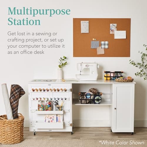 Best Choice Products Folding Sewing Table Multipurpose Craft Station & Side Desk with Compact Design, Wheels, Shelves, Storage Trays, Pegs, Magnetic Doors, Metal Doorknobs - White
