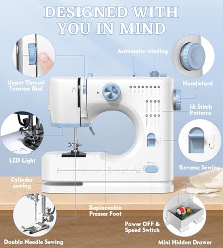 SEDNEE Sewing Machine for Beginners with 16 Built-in Stitches, Small Sewing Machine with Accessory Kit, 2-Speed, Foot Pedal & Storage Drawer, Portable Full-Feature Design for Home DIY (Blue)