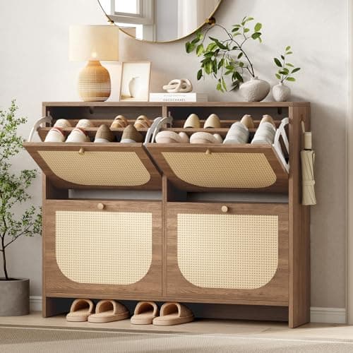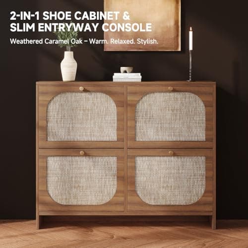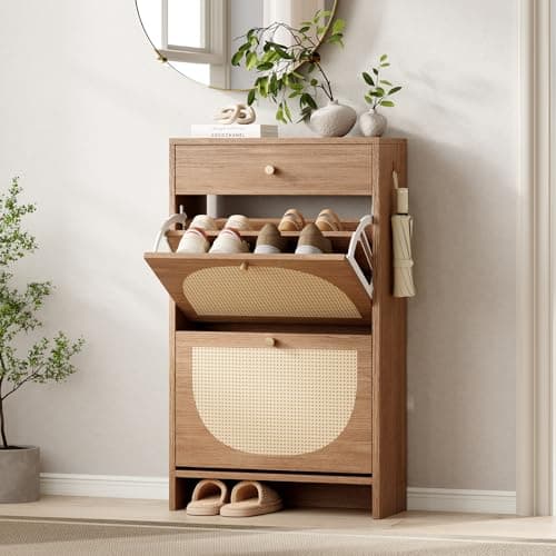 IRONCK Shoe Cabinet Storage with 2 Flip Drawers, Free Standing Wooden Shoe Storage Organizer Cabinet with Rattan Doors for Entryway, Narrow Shoe Rack Cabinet, Oak