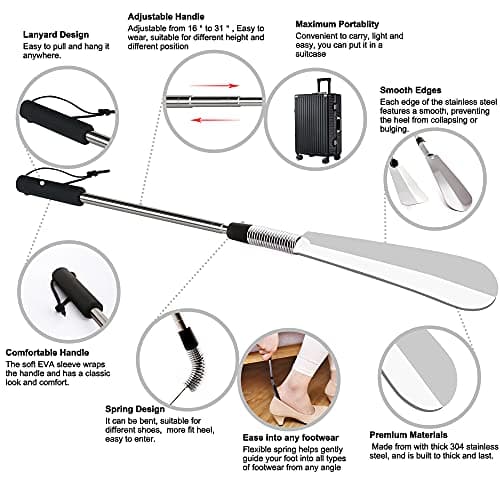 Fanwer Premium Long Handled Shoe Lifter 16" to 31" Adjustable Expander Shoe Horn - Extends & Collapses Stainless Steel Telescopic Spring Shoehorn