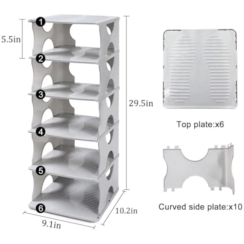 TXALWIQ 6-Tier Shoe Rack, Stackable Storage Organizer for Bedroom Entry, Adjustable Rack, Shoe Slots Shelf, Easy Tower Rack, Grey