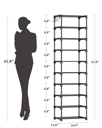 VTRIN Vertical Narrow Shoe Rack Organizer 10 Tier Tall Shoe Shelf Holds 20-22 Pairs with Non-Woven Dustproof Cover for Closet, Entryway Black