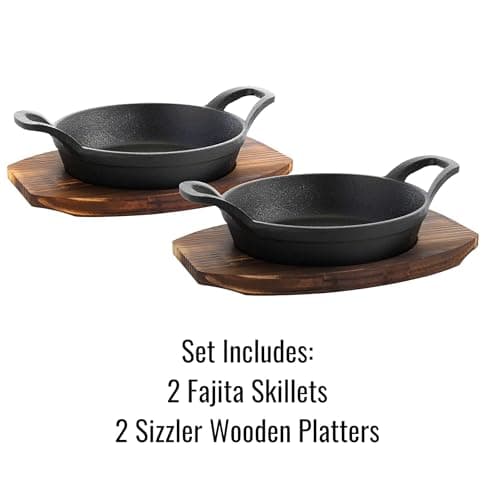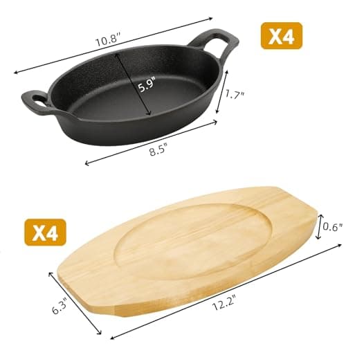 Bruntmor Mini Cast Iron Sizzler Plates Skillet Set Of 4. Oval Fajita Plate With Wooden Base/Pan Tray Serving Sizzling Dish And Fajitas, Hot Steak Skillet Dish Without Sinking (2 Sets)