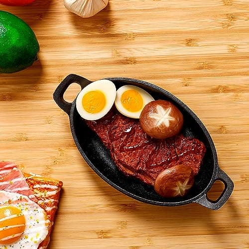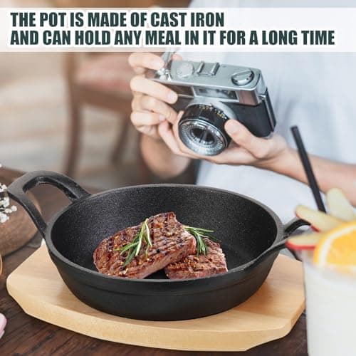 Mifoci 2 Pcs Oval Cast Iron Fajita Skillet Pan Set Small Sizzling Steak Plate with Wooden Base and Handle Cast Iron Fajita Skillet Sizzling Plate for Restaurant BBQ (9.5 in x 5.5 In)