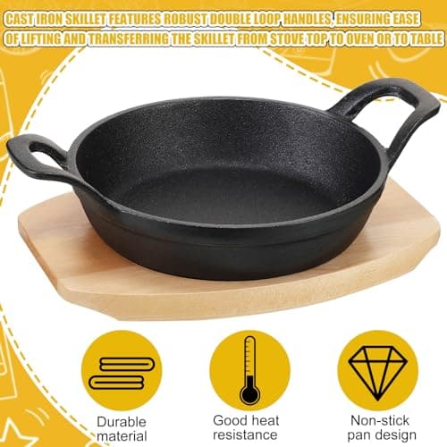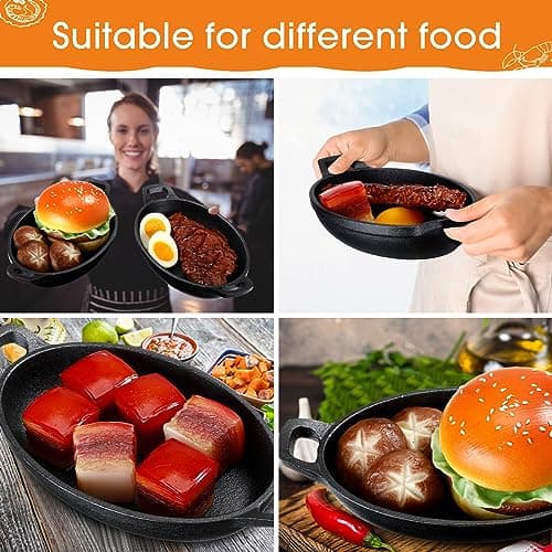 Mifoci 6 Pcs Oval Cast Iron Fajita Skillet Pan Set Small Sizzling Steak Plate with Wooden Base and Handle Cast Iron Fajita Skillet Sizzling Plate for Restaurant BBQ (9.5 in x 5.5 In)