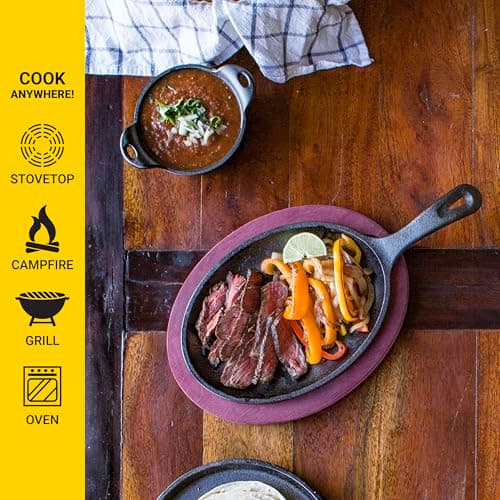 Mr. Bar-B-Q Cast Iron Fajita Skillets Set, Pre-Seasoned Non-Stick Sizzling Plate, Wooden Base w/Cloth Handle, Sizzler Steak Plate, Cast Iron Skillets for Diners, Bar, Restaurants, Caterings & Parties