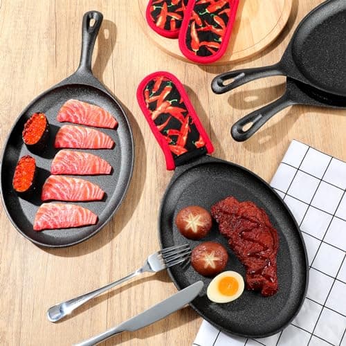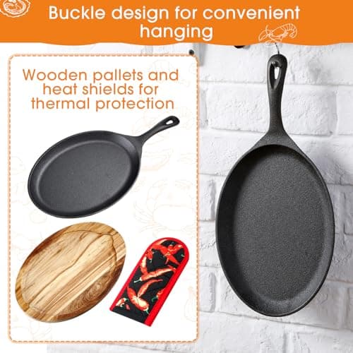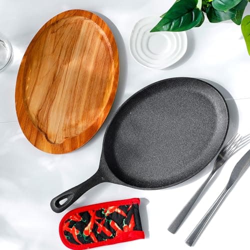 Lallisa 2 Sets Cast Iron Fajita Plate Set Fajita Plate Pan with Wooden Tray Anti Scald Protection Hot Mitt Cast Iron Skillet Set for Home Barbecue Kitchen Party Restaurant Catering Service