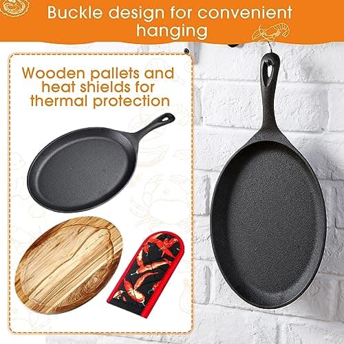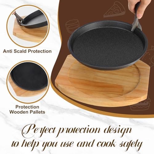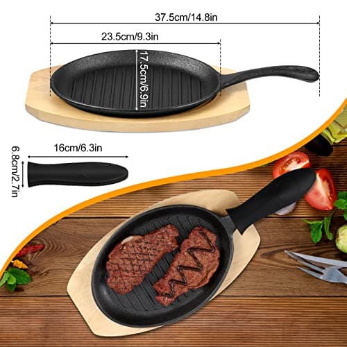 Tanlade 3 Sets Cast Iron Skillets Pre Seasoned Fajita Pan Heavy Duty Construction Sizzling Plates with Wooden Base and Silicone Handle Mitt, Black