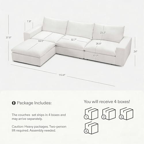 Hobestluk Modular Sectional Sofa Couches L-Shape Couch 3 Seat Modular Sofa Memory Foam Sectional Couches for Living Room, Cloud Couch with Oversized Chaise (96" Left Facing Chaise)