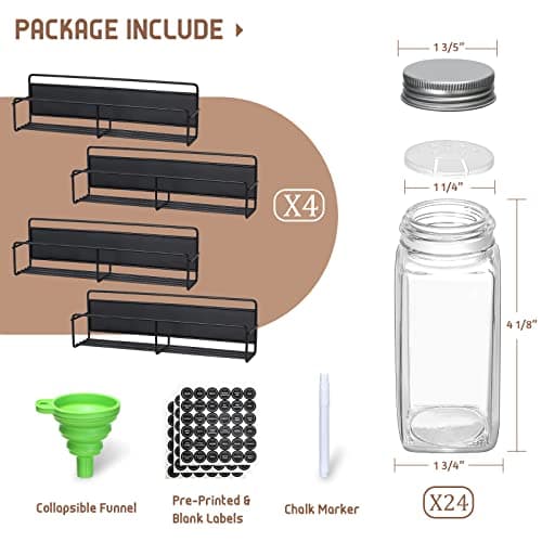 VITEVER Magnetic Spice Rack, 4 Pack, 24 Square Glass Jars with Lids, Quick-Find Pre-Printed Labels, Funnel, Space Saver, Refrigerator and Microwave Oven Organizer