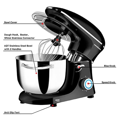 Seedeem Stand Mixer, 6Qt Electric Food Mixer, 660W 6-Speeds Tilt-Head Dough Mixers with Dishwasher-Safe Dough Hook, Wire Whip & Beater for Daily Use, Black