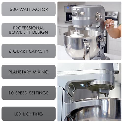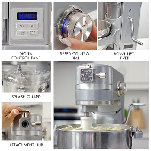 Kenmore Elite Heavy-Duty 6 Qt Bowl-Lift Stand Mixer, 600 Watts, with Flat Beater, Wire Whisk, Dough Hook, Stainless Steel Bowls, LED Light, Digital Countdown Timer, Metallic Grey