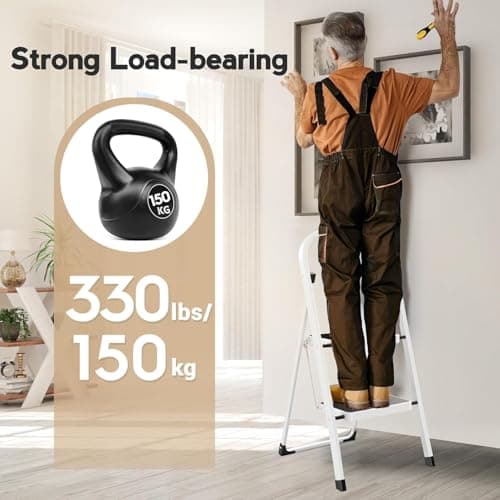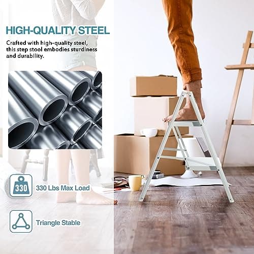 BOCOM 2 Step Ladder, Lightweight Portable Foldable Collapsible Folding Sturdy Iron Metal Step Stool with Anti-Slip Wide Pedal, Heavy Duty 330 lbs Capacity, for Home, Kitchen, Closet, Adults, White