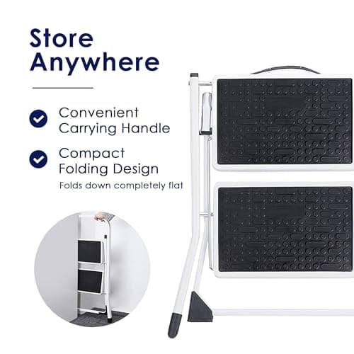 Delxo Portable Collapsible Lightweight Alloy Steel 2 Step Mini Stool Stepladder with Anti Slip Carry Hand Grip and Wide Pedal for Indoor Use, White