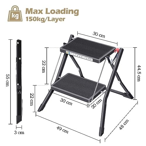 KINGRACK Folding Step, 2 Step Stepladder, Foldable, Ladder with Non-Slip Rubber mat, Step Stool with Release Button, Light Steel, for up to 330lbs, Black