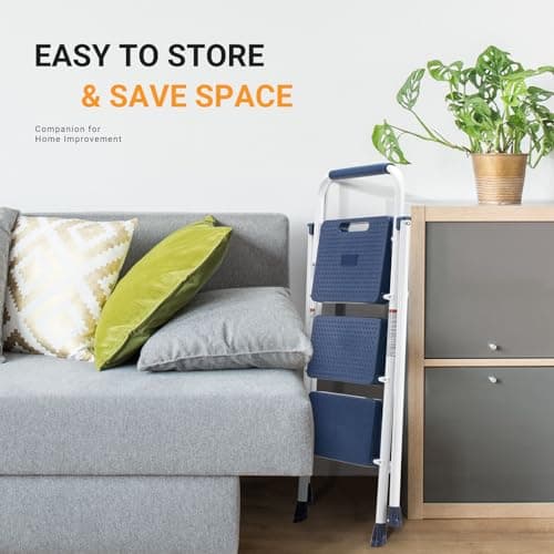 NEWBULIG 3 Step Ladder, Collapsible Step Stool with Safety Lock, Anti-Slip Rubber Feet, Lightweight Portable Ladder for Home Office Garage, Blue