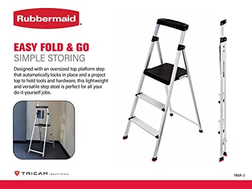 Rubbermaid 3-Step Steel Ladder,Folding Step Stool with Hand Grip and Non-Slip Feet, Silver, Tested to ANSI US Safety Standards, No Assembly Required