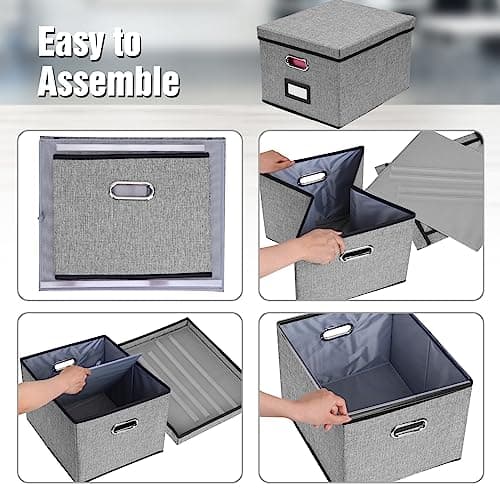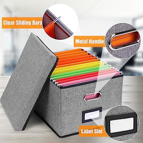 Huolewa Upgraded Portable File Organizer Box with Lid, Collapsible Linen Hanging Filing Storage Boxes with Plastic Slides, Decorative Home/Office Filing System Box for File and Folders Storage (Gray)