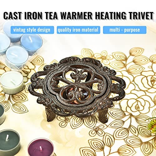 Sungmor Cast Iron Teapot Warmer Dish Cups Heater Pot Trivet - Rustic & Graceful Pattern Design with Tealight Holder - Heavy Duty & Decorative Candle Holder Stands for Heat Food Coffee Milk or Tea