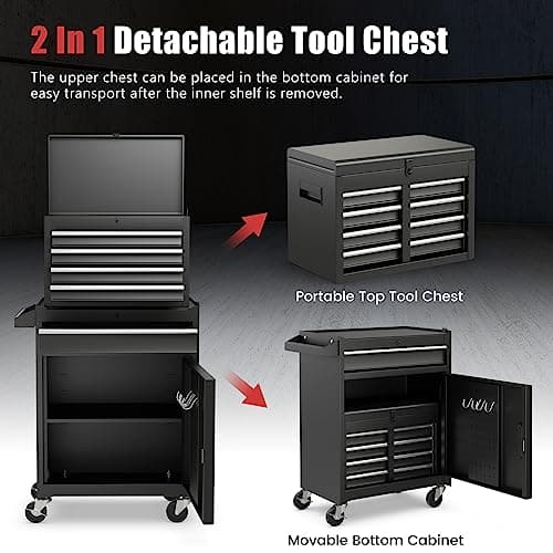 Goplus Tool Chest, 5-Drawer Rolling Cabinet with Detachable Top Toolbox, Lockable Wheels, Lock Bar, Protective Liner & Tool Rack, Metal Storage Cart for Garage Workshop