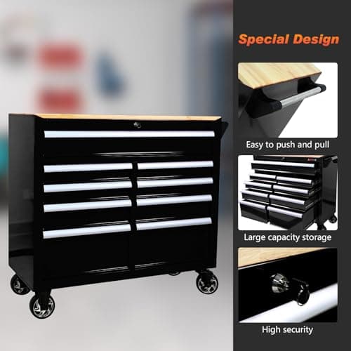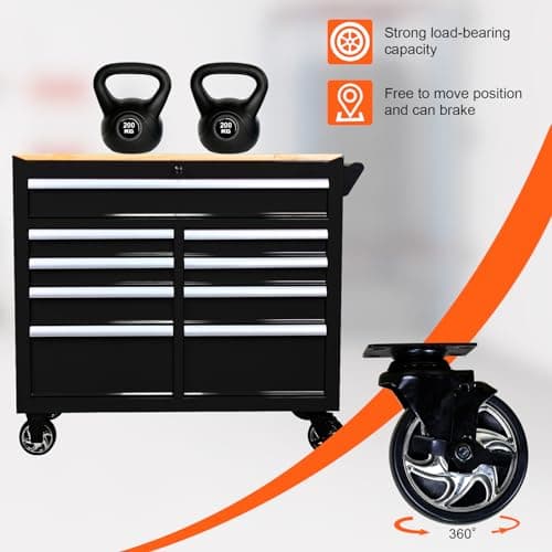 Heavy Duty Rolling Tool Chest with 9-Drawer Wood Top Tool Cart Mechanic Tool Box with Wheels Tool Storage Cabinet Mobile Workbench Tool Bench for Garage, Warehouse, Workshop, Repair Shop (Black)