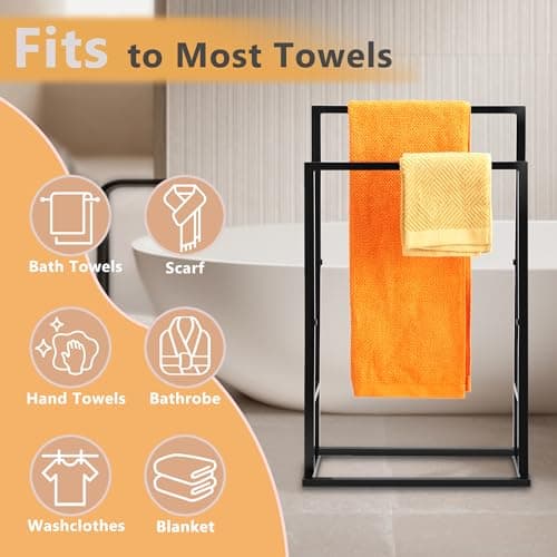 WISATO - Free Standing Towel Rack for Bathroom - Matte Black Finish - Stand Alone 2 Tier Stainless Steel Towel Rack for Bathroom Floor with Heavy Marble Base - Double T Shape Drying Stand for Towels