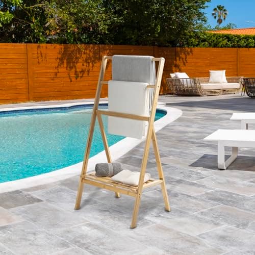 MyGift 3 Tier Free Standing Towel Rack for Bathroom, Pool Outdoor, Foldable Blanket Ladder with Storage Shelf, 43" H Bath Towel Holder Organizer Drying Rack, Light Brown Solid Bamboo Quilt Rack
