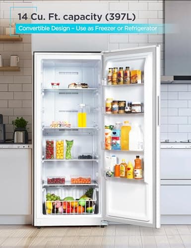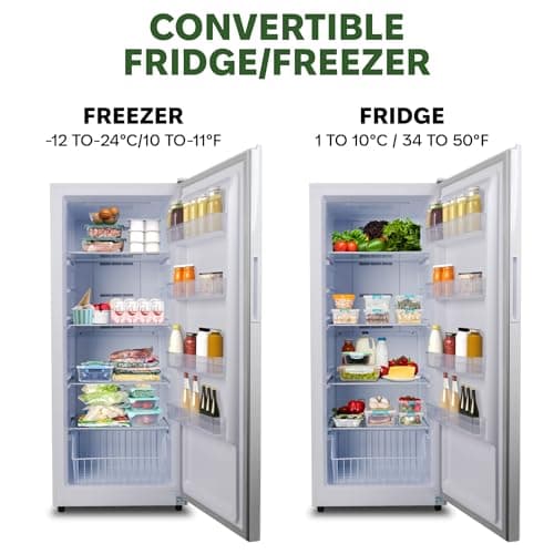 Hamilton Beach 17 cu ft Upright CONVERTIBLE Fridge/Freezer-Frost Free-Reversible Door-Removable Glass Shelves-LED Interior Light- Electronic Temperature Control, Energy Efficient, White, 17 cu. ft.