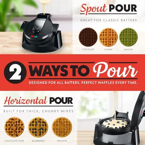 Gourmia Dual Pour Waffle Maker – Belgian Waffle Maker with Mess Free Spout, Nonstick Plates, Compact Upright Storage, 800W, Black