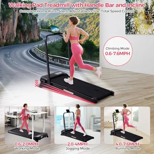 Yagud Walking Pad Treadmill with Handlebar and Incline, Anti-Slip Compact Under Desk Treadmill with Remote Control, 2.5HP Walking Jogging Running Machine for Home Office, Folding Quiet Portable