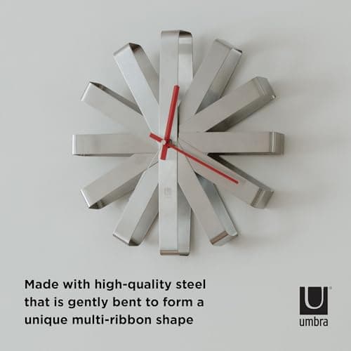 Umbra Ribbon Modern 12" Wall Clock, Silent Non Ticking Battery Operated Quartz Movement, Stainless Steel