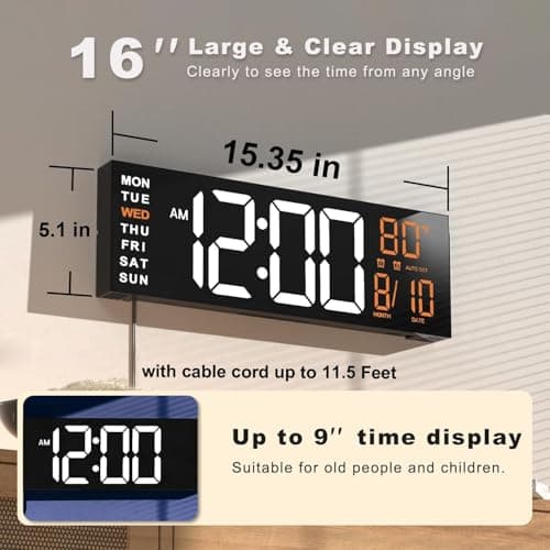 MASHI Digital Wall Clock, 16" Large Display Digital Clock with Remote Control, Auto-Dimming Wall Clock with Night Light, DST, Date Week,Temp for Living Room, Bedroom, Decor, for Elderly