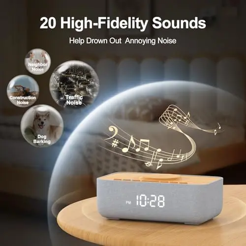 Sound Machine Alarm Clock Wireless Charger: Bluetooth 10W Stereo Sound Speaker Bedroom - White Noise Machine for Sleeping with 21 Soothing Sounds