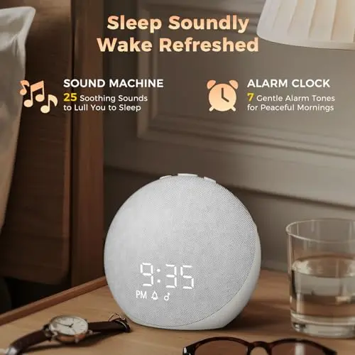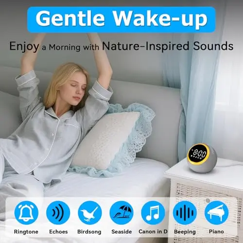 Sound Machine Alarm Clock for Bedroom: 25 Natural Sleep Sounds - White Noise Machine for Adults Kids Baby - Gentle Wake Up Alarm with Bluetooth Speaker - Frost White