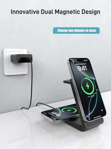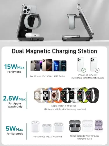 Wireless Charger for Apple Charging Station, Dual MagSafe Charger for iPhone 17/17 Pro/17 Pro/iPhone 16 Pro Max//AirPods, 3 in 1 Foldable iPhone Charging Station, Watch Charger for Apple iWatch Series