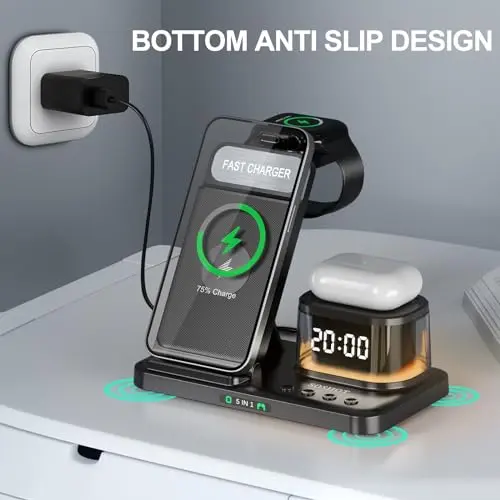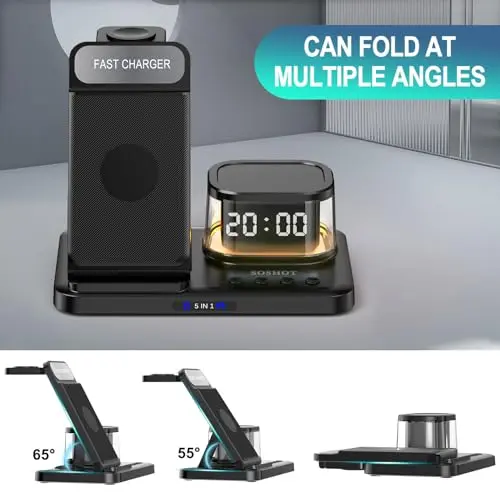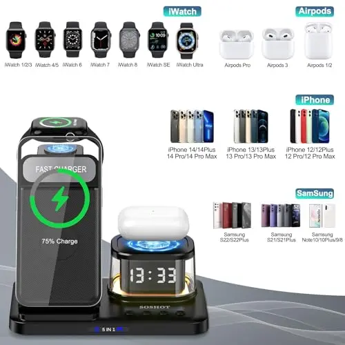 SOSHOT 5 in 1 Wireless Charger with Clock Night Light Alarm Clock for Apple Devices for iPhone 15 14 13 12 11 Pro Max Apple Watch for Apple Watch - Black
