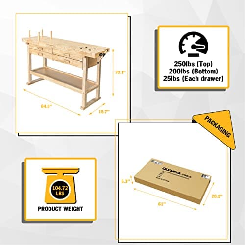 Olympia Tools 60-Inch Rubber Hardwood Workbench with 4-Drawers - 450lbs Weight Capacity Heavy Duty Portable Wood Work Bench Table for Garage, Workshop, Home Storage - Woodworking Wooden Workbenches