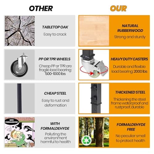 48" Adjustable Work Bench, Rubber Wood Top Workbench Heavy-Duty Work Table with Wheels, 2000 LBS Load Capacity Hardwood Work Benches for Garage, Workshop, Home, Office, Easy Assembly