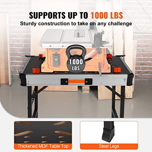VEVOR Folding Work Table, 2-in-1 as Sawhorse & Workbench, 1000 lbs Load Capacity, Steel Legs, Portable Foldable Tool Stand with 2 Wood Clamps, 4 Bench Dogs, 3 Tool Boxes, 2 Hooks, Easy Garage Storage